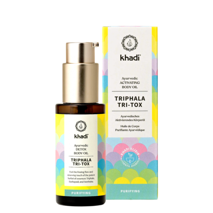 Khadi elixír olej Triphala Tri-tox: svěží lehkost pro Vaši pokožku. Vnímejte odlehčení a osvobození, když ájurvédská stimulující síla prostupuje Vaši pokožku, aby odváděla a pročišťovala.
