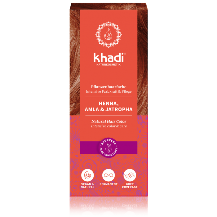 Khadi Henna & Amla & Jatropha je čistě přírodní barva na vlasy bez syntetických barvicích složek, zvýrazňovačů barev, kovových solí či konzervantů.