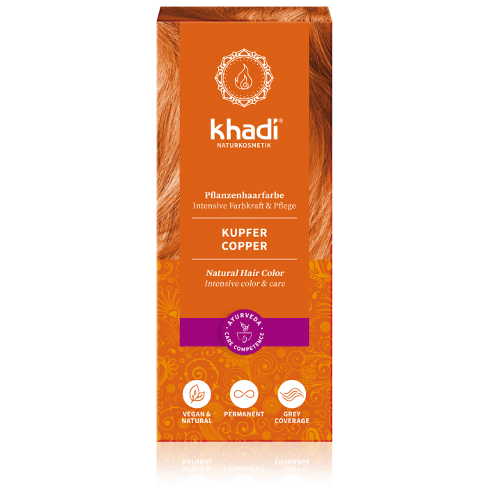Most mezi blond a červenou – Khadi rostlinná barva na vlasy Měděná obarví Vaše vlasy živou, zářivě zlatou měděnou. Čistě přírodní ingredience dávají vlasům intenzivní třpytivé barevné odlesky a poskytují bohatou péči. Khadi Měděná dodá Vašim vlasům přirozenou zářivou barvu, objem a lesk. Výsledná barva závisí na stávající barvě Vašich vlasů - pohybuje se od zářivě měděné zlaté až po ohnivou měděně červenou. Pro třpytivě měděné odlesky a pružnost Vašich vlasů.